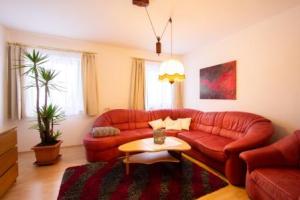 Das liebevoll eingerichtete Wohnzimmer hat einen Flat TV mit internationalen Sendern und eine große Couch zum Relaxen.